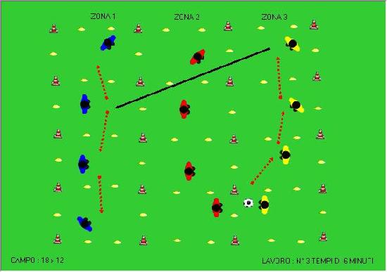 In un campo avente dimensioni m 18x12 , diviso in tre zone ciascuna delle quali misura m 6X12, si dispongono tre linee difensive composte da 4 giocatori. Nella figura inizia la squadra blu. Lo scopo è quello di muoversi (rimanendo ognuno all'interno dello spazio di competenza di m 6x3) trasmettendosi la palla (con obbligo di 2 tocchi) cercando il momento opportuno per passare la palla alla linea gialla senza che i rossi centrali intercettino il passaggio. Se la palla arriva correttamente ai gialli, saranno loro a cercare nuovamente il passaggio filtrante con i rossi che nel frattempo si sono orientati verso i gialli nel tentativo di intercettare. Il Mister può stabilire delle regole a punti per ogni passaggio giusto o intercettato. L'esercitazione, per essere più stimolante, può diventare un "mini torneo" fra le tre linee che chiaramente vanno intercambiate in modo che ognuna possa esercitare sia il possesso palla che l'intercettazione della stessa.