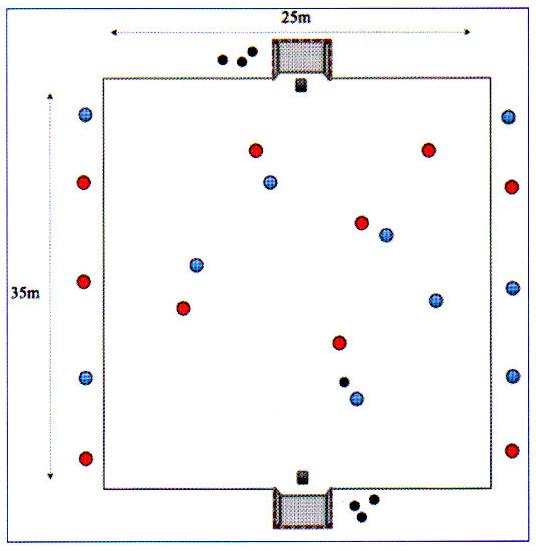 In un campo avente dimensioni 35x25 si affrontano due squadre formate ognuna da 5 giocatori più il portiere. Sui lati lunghi del campo vi sono altre due squadre (formate da 5 elementi) i cui giocatori fungono da sponda potendo toccare il pallone con un solo tocco. All'interno del campo il gioco si sviluppa con regole diverse dettate dal Mister (1-2-3 tocchi o partita libera ecc).