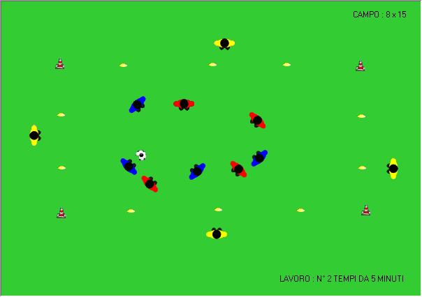 In un campo avente dimensioni 8x15 si affrontano due squadre formate ognuna da 4 giocatori esercitano il possesso palla. Su ogni lato del campo vi è un giocatore che funge da sponda, potendo toccare il pallone con un solo tocco.