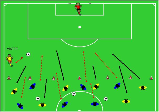In uno spazio equivalente ad una metà campo, due squadre di differenti colori esercitano un possesso palla con più palloni. Le regole legate alla trasmissione della palla vengono dettate dal mister con cambio sequnza dei colori. Questo per tenere alta l'attenzione e la concentrazione nei giocatori. Nel frattempo, fra i pali, il portiere esegue esercizi specifici di ruolo con il preparatore (in alternativa con un collaboratore del mister o semplicemente un suo compagno di squadra). Mentre prosegue il possesso palla, il mister lancia una palla in direzione della porta chiamando contemporaneamente il colore della squadra che attaccherà la porta stessa cercando di finalizzare l'azione con il goal. L'altra squadra dovrà posizionarsi in difesa della porta tentando di interrompere l'azione. Nel frattempo, al comando del mister, il portiere dovrà sospendere gli esercizi e posizionarsi immediatamente, ed in modo corretto, per difendere i pali.