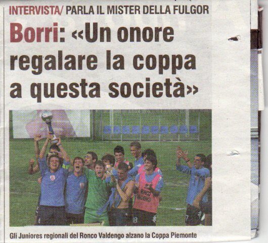 Abbiamo detto del Colline Alfieri Don Bosco, ma non dimentichiamo gli impegni di carattere umanitario per la Fulgor Ronco Valdengo, neo organizzatrice di un torneo internazionale dal 3 al 5 giugno con la presenza degli amici svedesi dell'Enkoping (cittadina a 40 Km Stoccolma) dai quali saranno ospitati ai primi di luglio (con Mr. Borri ad accompagnare i ragazzi) per il quarto anno consecutivo alla Globall Cup, torneo voluto dal responsabile ONU Jonas Nystrom (gentile ospite in Biella pochi giorni fa con i ragazzi svedesi) per sensibilizzare la lotta contro le mine anti uomo nei paesi colpiti da eventi bellici. Inoltre la Fulgor Ronco Valdengo è l'unica Società dilettantistica in Italia patrocinata da UNICEF, ottenuto proprio per lo spirito con il quali i Dirigenti affrontano il rapporto con i loro tesserati, nell'ottica di fare sport con l'intento di far crescere i ragazzi anche e soprattutto dal punto di vista umano.