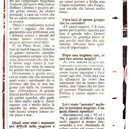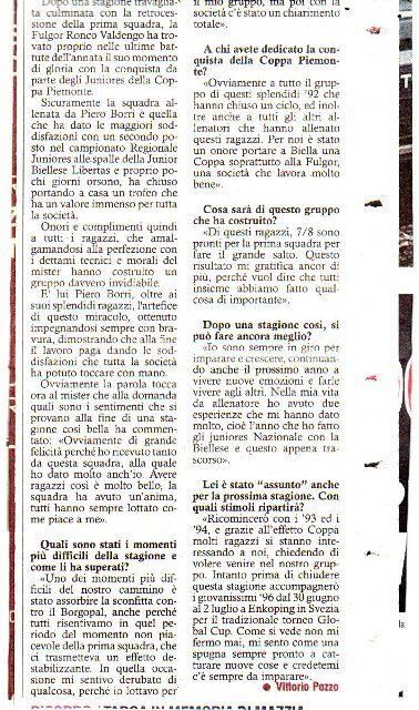 Allora appuntamento a sabato prossimo nella gara casalinga con il CVR 2005 ? "Direi proprio di si, mi piacerebbe molto che anche i tifosi ci stessero vicini come hanno sempre fatto durante la stagione ed incitassero i ragazzi nel cammino di Coppa. Immagino il comunale di Valdengo con tanta gente, con i ragazzi che militano nella Fulgor che ci seguono e ci spronano ad andare fino in fondo. Potrebbe essere l'anno giusto, in campionato abbiamo cullato a lungo un sogno che è svanito per due punti, ora vogliamo che quel sogno continui in Coppa. L'unico mio pensiero resta quello di vedere Capitan Colombera alzare quella Coppa in cielo. Voglio che sia anche il sogno di chi ci segue, e una grande soddisfazione da regalare ai Dirigenti" !!!