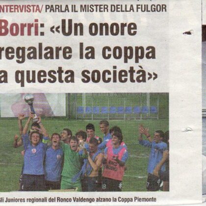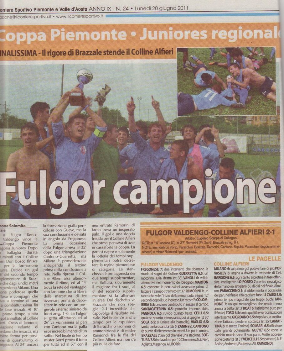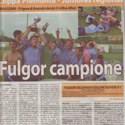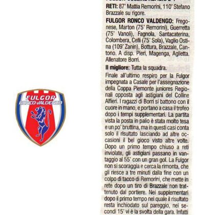 A CASALE IL CIELO E' SEMPRE PIU' AZZURRO !!! In un pomeriggio dai tanti risvolti meteorologici che questo mese ci ha abituati, la Fulgor tinge di azzurro la finalissima di Coppa Piemonte in una giornata storica per la Società presieduta da Marco Lanza. Il tanto ambito e desiderato trofeo da stasera brillerà nella bacheca della sede di Ronco Biellese. La alza Capitan Colombera davanti al folto pubblico approdato al campo di Via De Cristoforis per sostenere la "Borri Band" nell'ultimo atto di una stagione che rimarrà, nel ricordo di chi l'ha vissuta, fra le più belle degli ultimi anni. Colline Alfieri Don Bosco che soccombe per 2-1 al termine dei tempi supplementari.