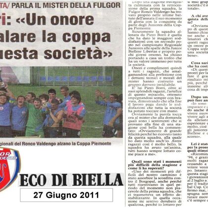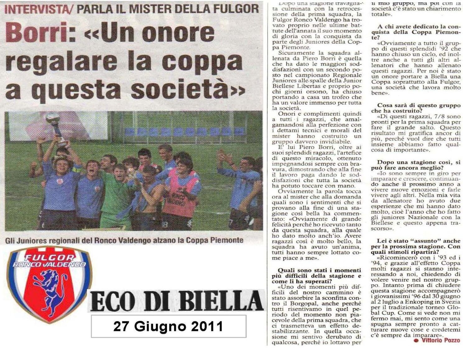 Attraverso le interviste rilasciate dal "Filosofo" ripercorriamo il cammino della Coppa Piemonte del 2011, un anno da incorniciare per i Ragazzi della Juniores Regionale della Fulgor Ronco Valdengo dell'allora Presidente Marco Lanza, portata magistralmente al trionfo dal loro condottiero, Mr. Piero Borri