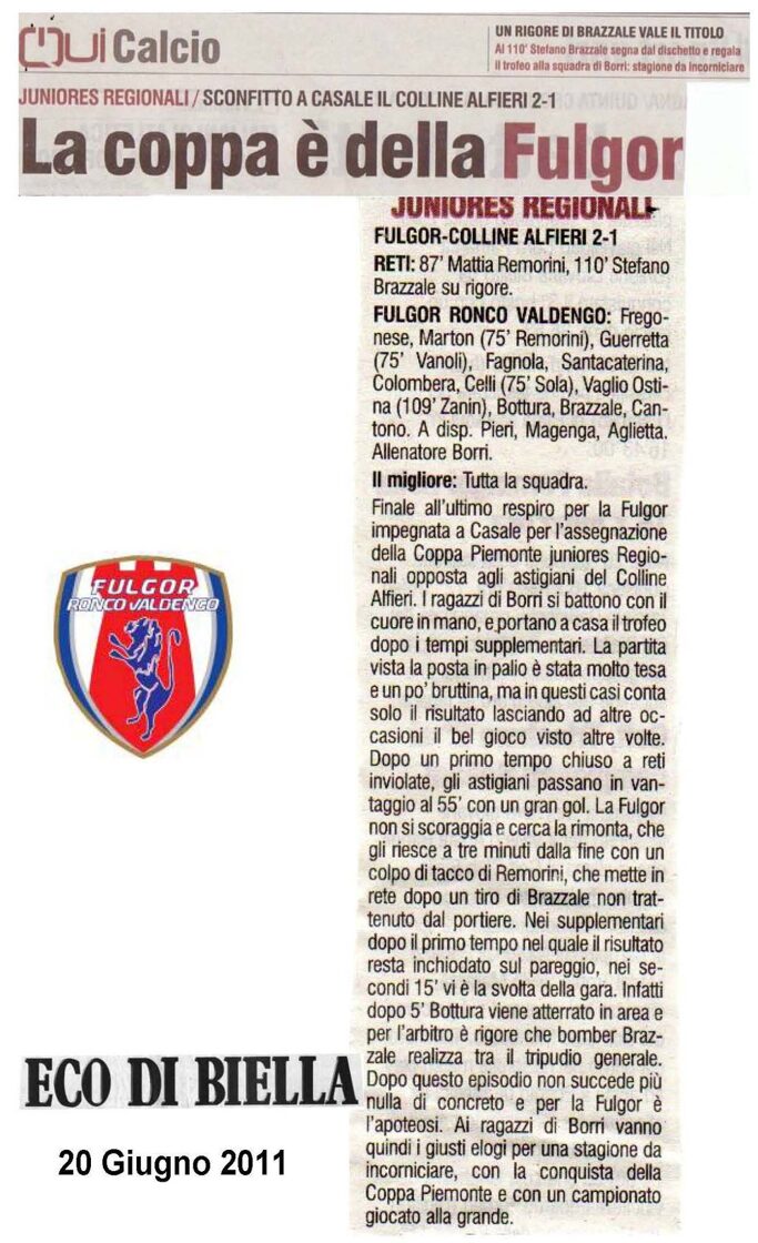 Il neo entrato si fionda in area per far parte degli sviluppi della punizione. Batte Brazzale e la palla carambola davanti a Milano. Il più veloce di tutti è proprio Remorini che di tacco spinge la palla in rete. Apoteosi in campo e sugli spalti. Siamo a due minuti più recupero (che sarà di altri quattro giri di orologio) dalla fine e la Colline Alfieri accusa il colpo e rischia di capitolare già prima del 90° ma i tempi regolamentari dicono che, per alzare la Coppa, servono i supplementari. Le squadre sono stanche ma la Fulgor non molla dimostrando il carattere che l'ha contraddistinta in tutta la stagione. Vanoli disegna traiettorie per i suoi degne di nota e la spinta è sempre più efficace. A centrocampo si soffre di meno ed al 4° del secondo tempo supplementare, dopo 109 minuti di lotta, esce Vaglio Ostina per far posto a Zanin. Passano due minuti e Cantono, imbeccato al limite dell'area, difende magistralmente una palla fa blocco sul diretto avversario e lascia un corridoio d'oro dove si infila Bottura. La punta della Fulgor si invola verso la porta ma viene atterrata. Rigore sacrosanto. Sul dischetto si presenta Brazzale e fulmina Milano. Pubblico in delirio sugli spalti con 9 minuti più recupero da giocare per l'appuntamento più atteso dell'anno, che arriva puntuale al 120° !!! Da quel momento finisce una stagione lunghissima ed inizia per la Fulgor ed il fantastico gruppo della Juniores la ... STORIA !!! Un trofeo che, grazie ai ragazzi del "Filosofo", approda nel biellese e da ieri, come detto, brilla in sede. Mr. Borri si defila e lascia spazio ai suoi ragazzi in delirio per la gioia. E' visibilmente emozionato e quando la curva lo vuole con sé per festeggiare, ancora in lacrime, riceve l'abbraccio di tutta la squadra e viene portato in trionfo. La Coppa prende la strada di Ronco ed agli avversari non resta che, molto sportivamente, riconoscere la supremazia degli azzurrini. Non ci sono più parole per descrivere ciò che succede nel dopo gara fra cori e gavettoni (che non risparmiano il Mister portato letteralmente sotto la doccia dai suoi). E' festa per tutti, una festa tanto attesa ed ottenuta con un cammino strepitoso che ha regalato tonnellate di emozioni che diventano difficili da decifrare nell'immediato. Ci vorrà del tempo per capire veramente cosa sono stati in grado di fare questi ragazzi ma non è il momento per le domande, è solo il momento per liberare in cielo il grande urlo dei Campioni !!! Ci riserveremo di tornare sul grande sabato degli azzurrini con più calma nei prossimi giorni, per analizzare assieme al Mister il grande cammino di Coppa.