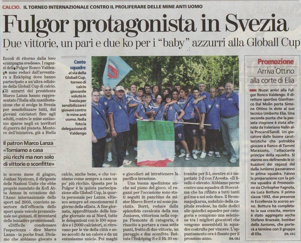 E’ diventato da anni un appuntamento classico, per la ASD Fulgor Ronco Valdengo, Società all’ombra del Brick approdare  in Svezia, precisamente ad EnkÖping, cittadina a nord ovest di Stoccolma. La delegazione di Dirigenti e Giocatori  rappresenta  l’Italia alla manifestazione annuale della GLOBALL CUP,  per dire di NO alle MINE ANTIUOMO, impegno portato avanti dall’ONU.